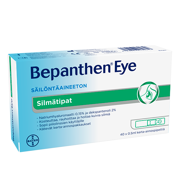 Bepanthen Eye silmätipat lievittävät kuivien, ärtyneiden ja väsyneiden silmien oireita voitelemalla silmän pintaa ja suojaamalla sitä kuivumiselta pitkäaikaisesti. Bepanthen Eye silmätipat kosteuttavat sumentamatta näköä. Ei sisällä säilöntäainetta. Sopii hyvin pitkäaikaiskäyttöön sekä piilolinssien käyttäjille.